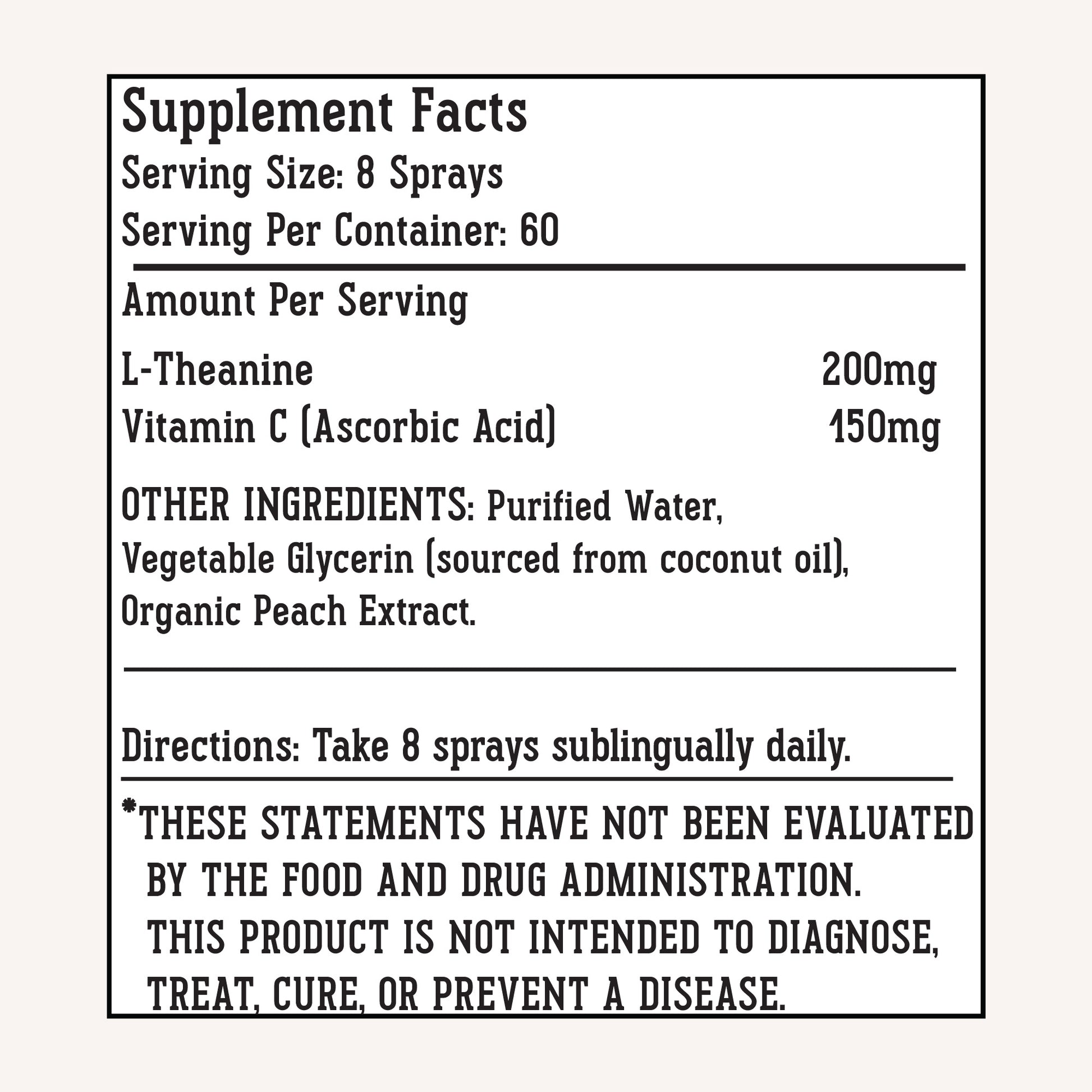 Ingredients: Purified Water, Organic Vegetable Glycerin (sourced from coconut oil), L-Theanine, Ascorbic Acid, Organic Peach extract.
