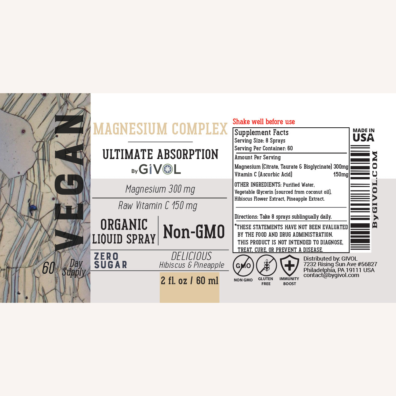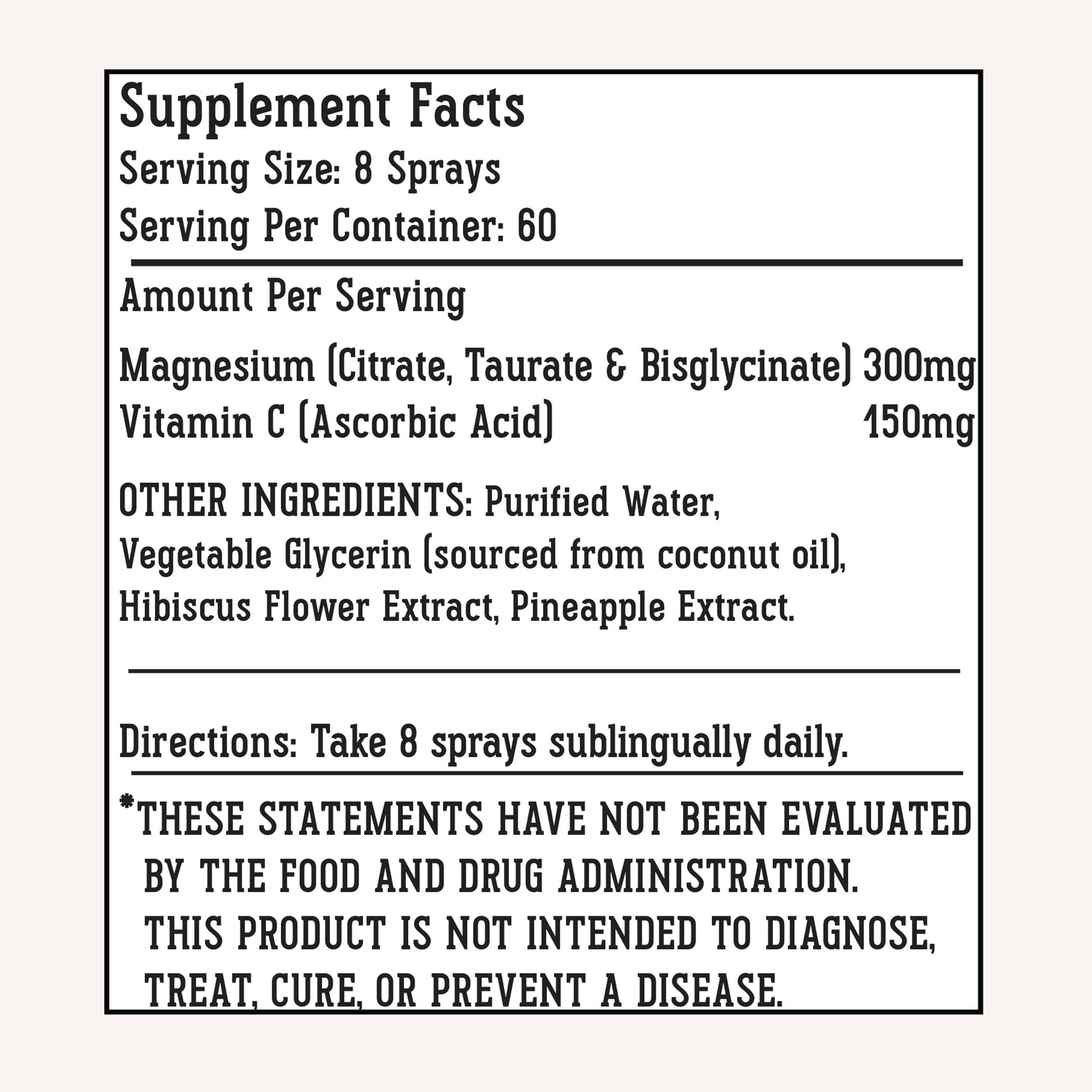 Ingredients: Purified Water, Organic Vegetable Glycerin (sourced from coconut oil), Magnesium Biglycinate, Citrate & Taurate, Ascorbic Acid, Organic Hibiscus flower extract, Organic pineapple Extract.